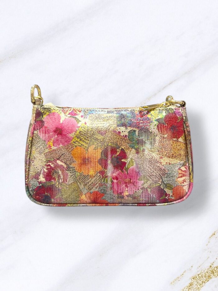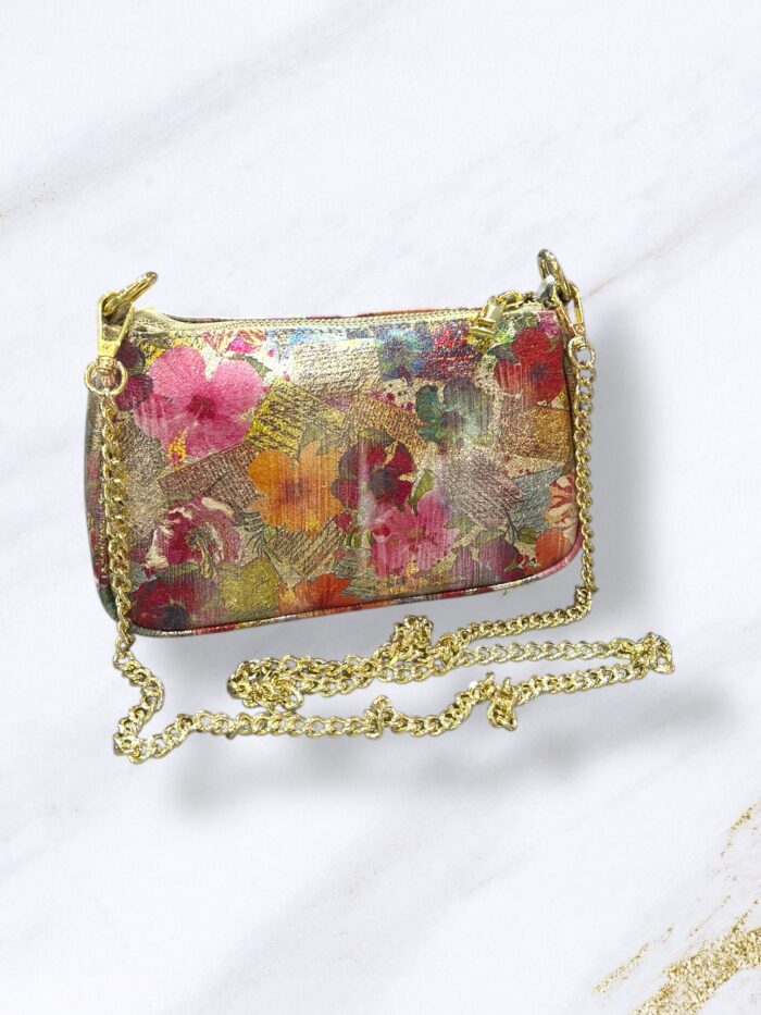 Χρυσή δερμάτινη τσάντα μικρή με λουλούδια