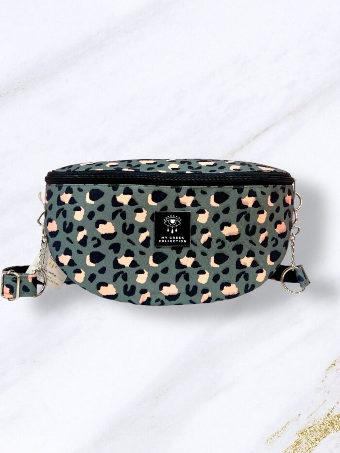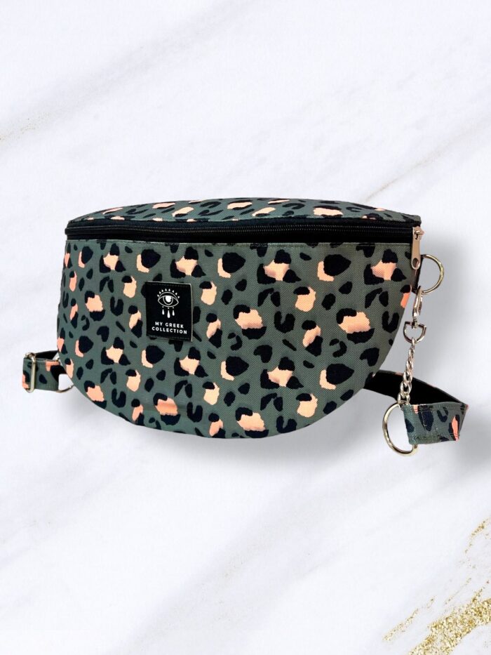 Tσάντα μέσης γκρι/ροζ animal print. Διαστάσεις 35Πx18Υx9Φ. Δύο τσέπες, εσωτερικά και στην πίσω πλευρά.
