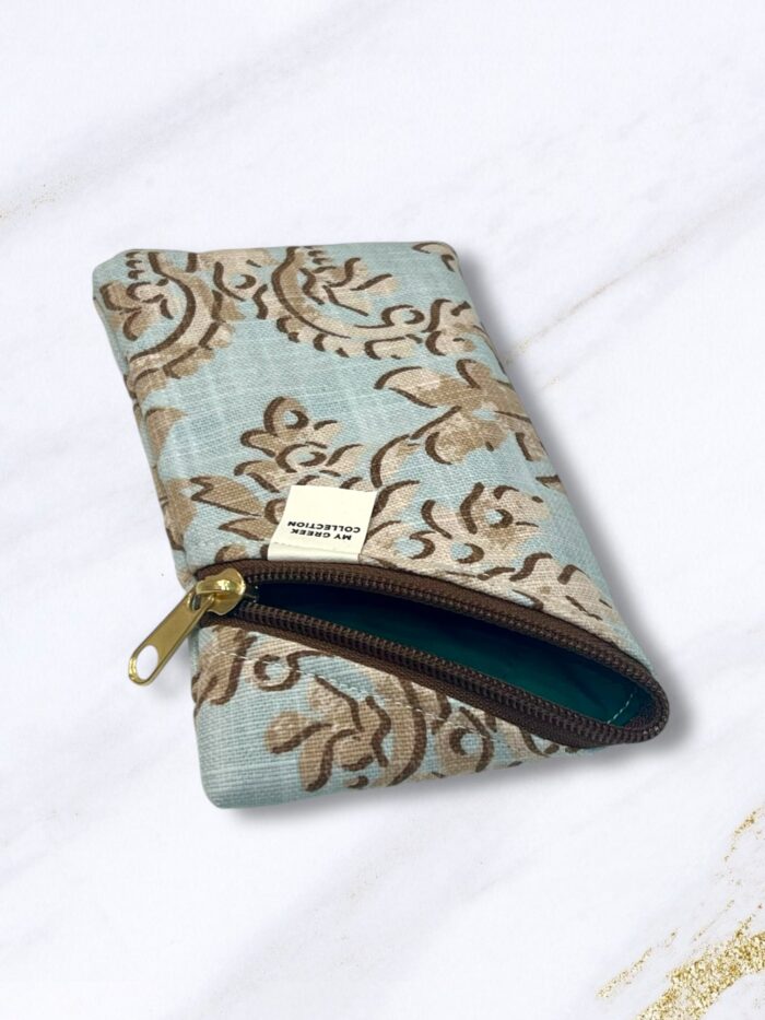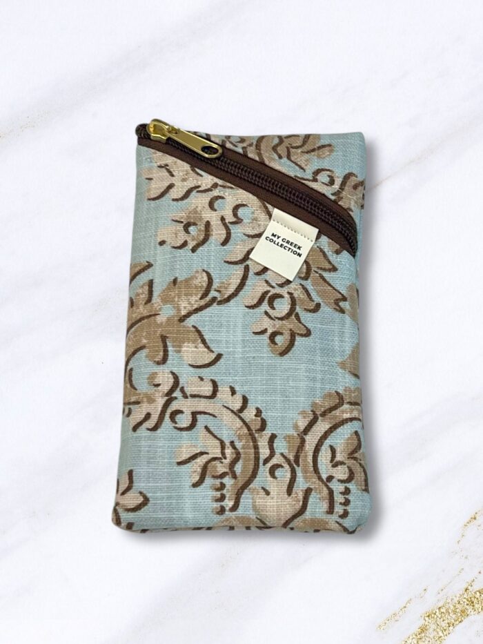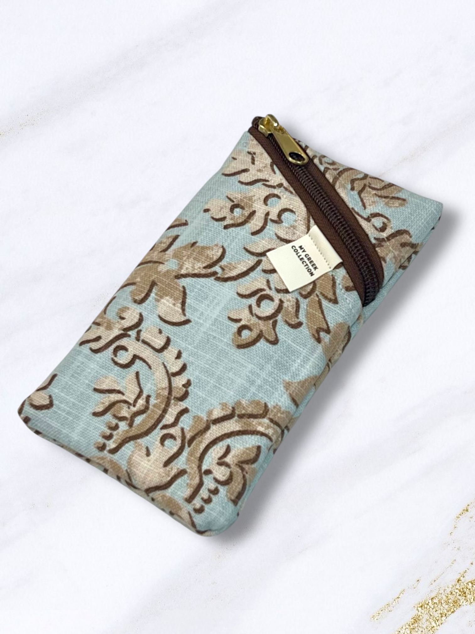 Χειροποίητη θήκη κινητού υφασμάτινη με καπιτονέ επένδυση εσωτερικά και φερμουάρ. Διάσταση: 11×19 εκ.