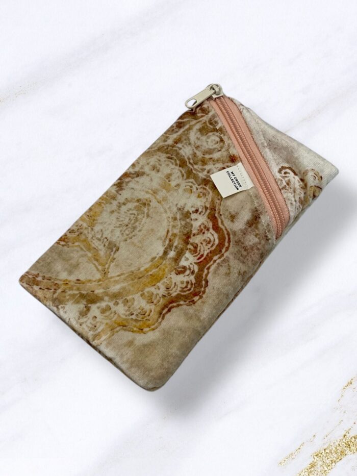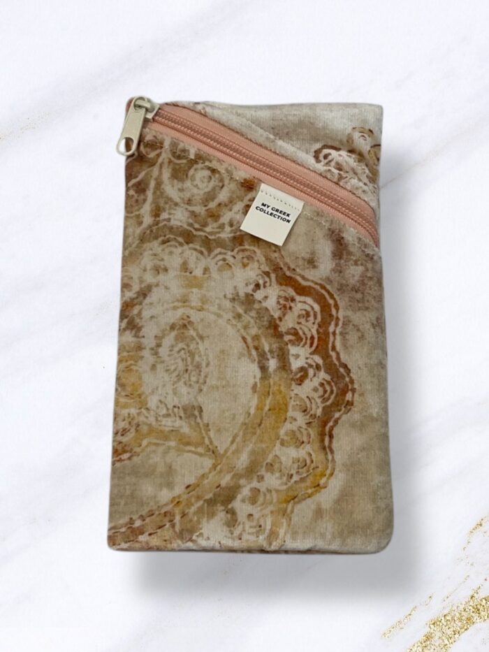 Χειροποίητη θήκη κινητού υφασμάτινη με καπιτονέ επένδυση εσωτερικά και φερμουάρ. Διάσταση: 11×19 εκ.