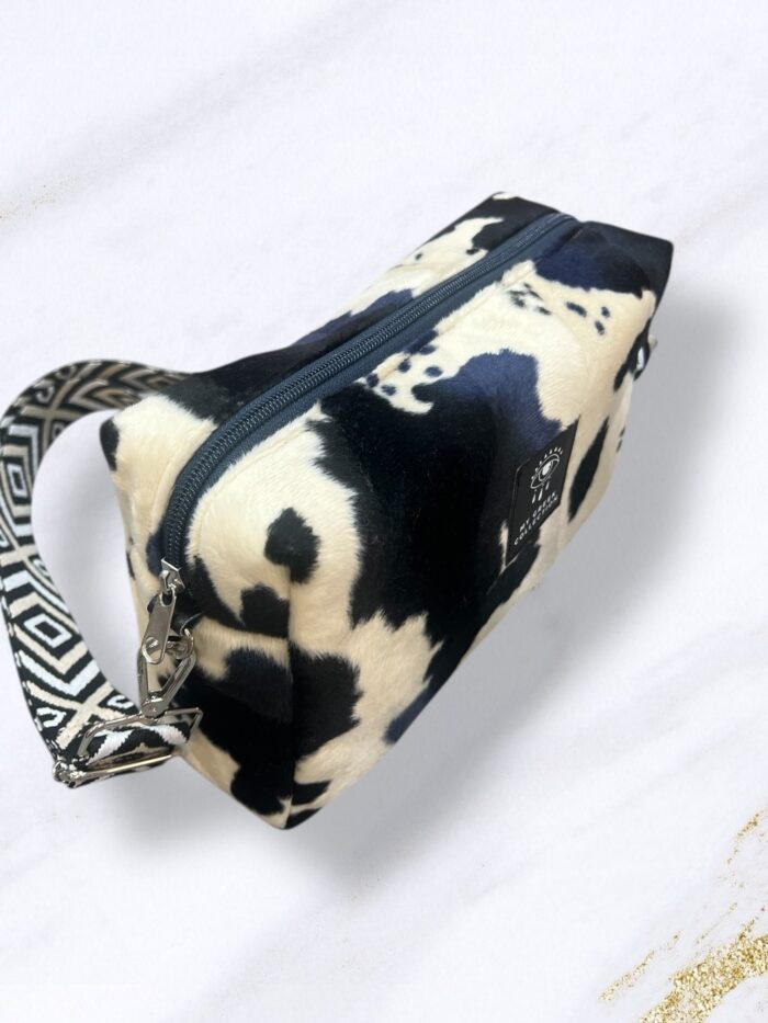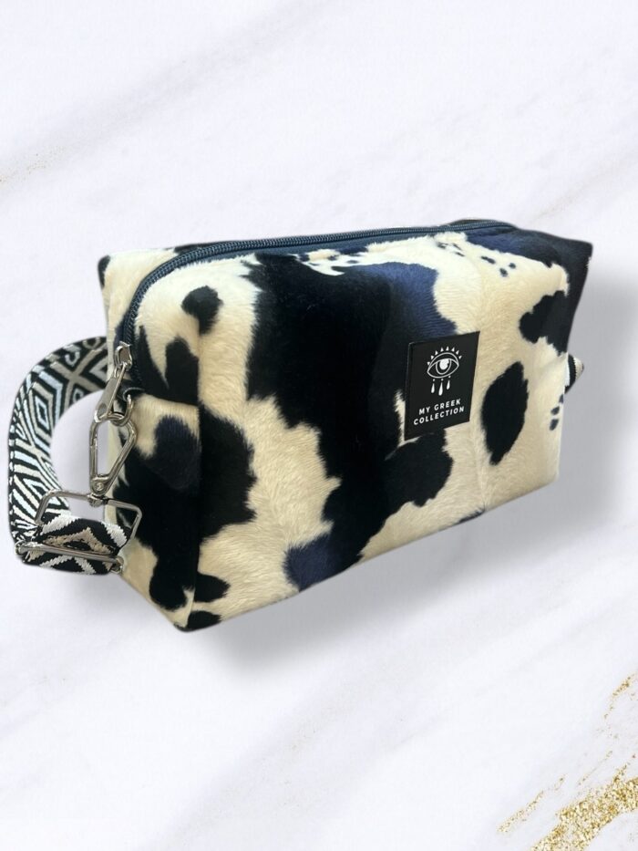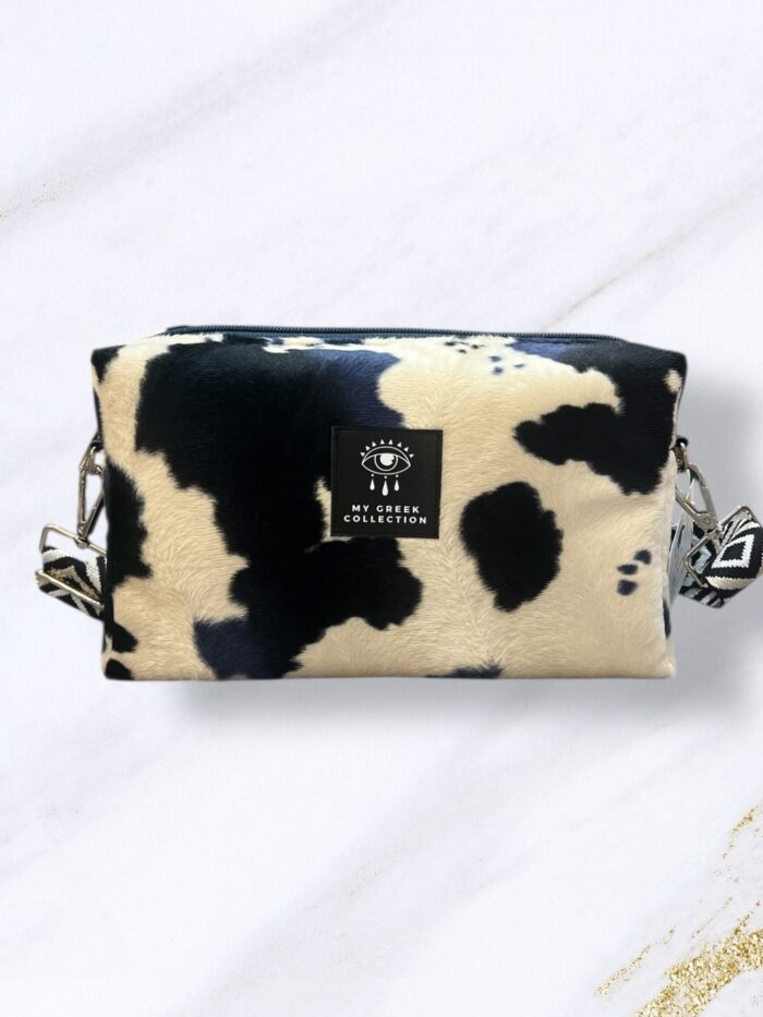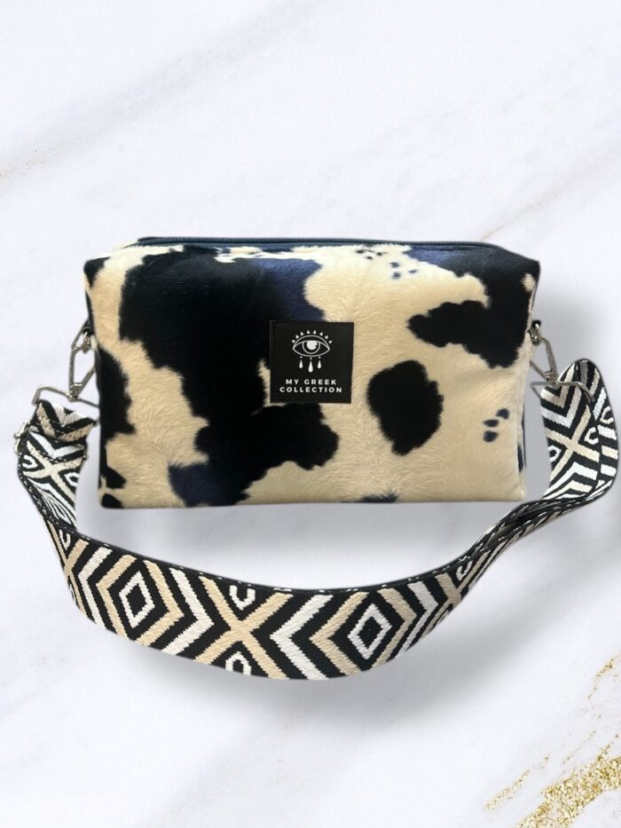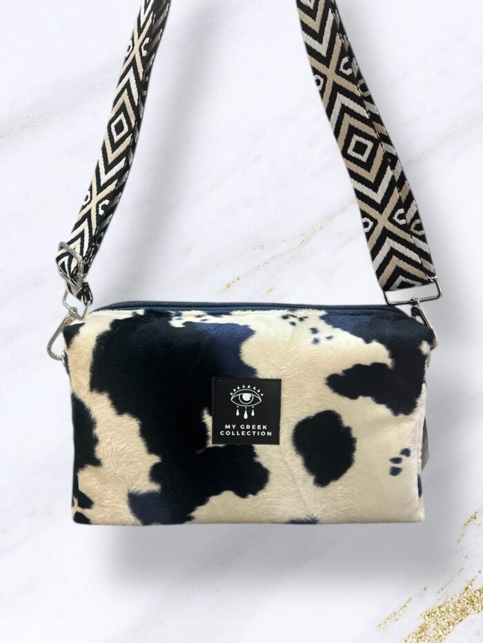 Τσάντα χιαστί κοντότριχη γούνα αγελάδα ασπρόμαυρη με μπλε