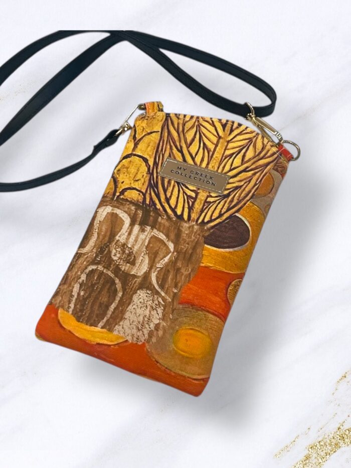 Υφασμάτινη τσάντα κινητού με λουράκι για κρέμασμα στο λαιμό ή χιαστί. Με μαγνητικό κούμπωμα.