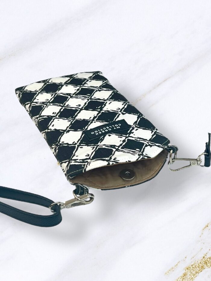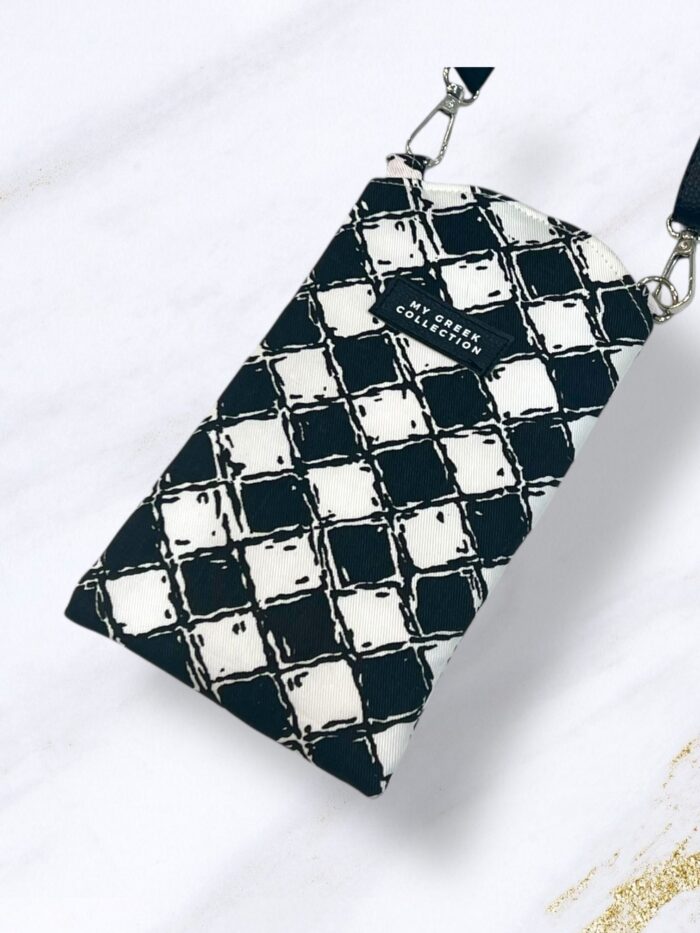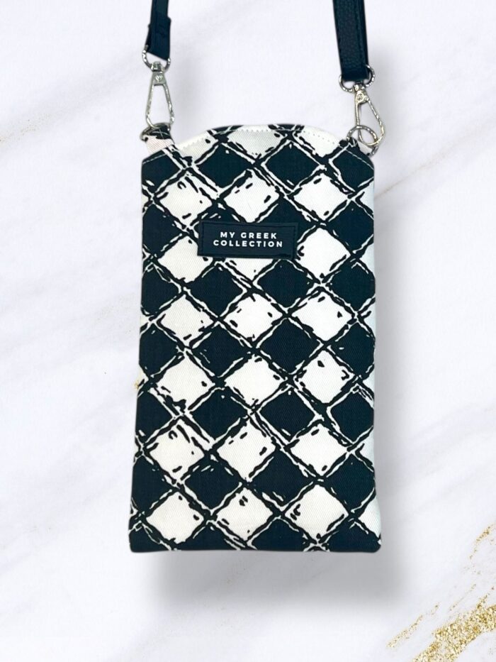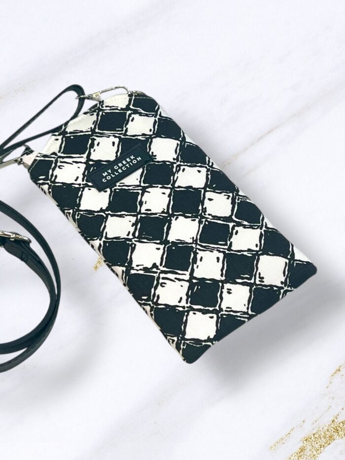 Υφασμάτινη τσάντα κινητού με λουράκι για κρέμασμα στο λαιμό ή χιαστί. Με μαγνητικό κούμπωμα.
